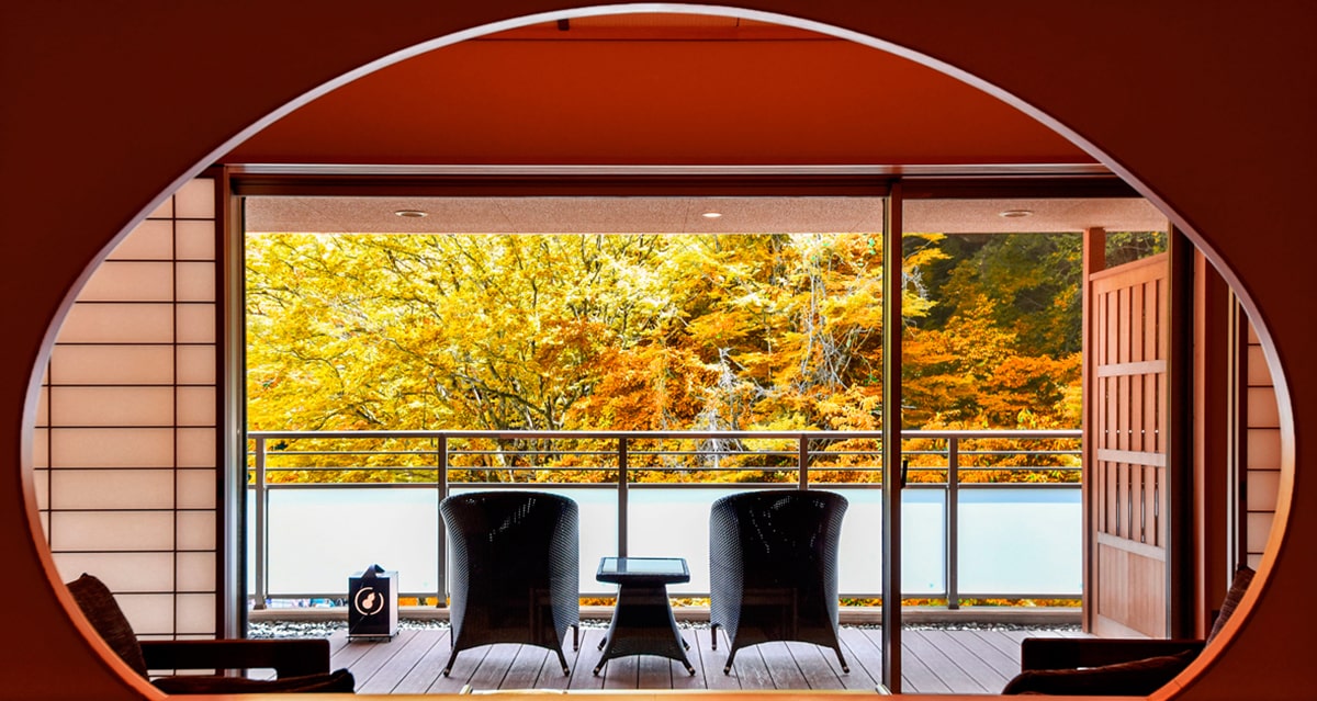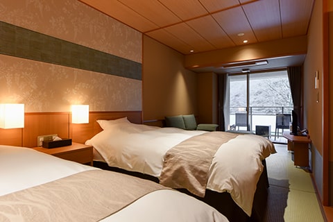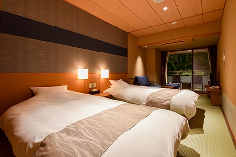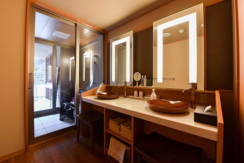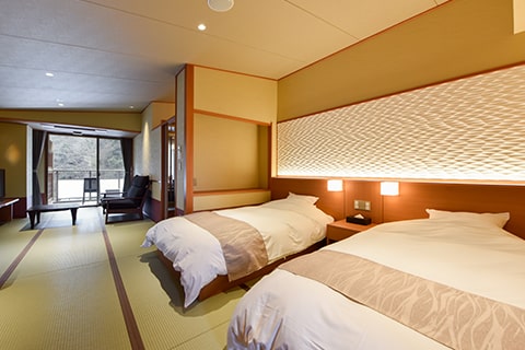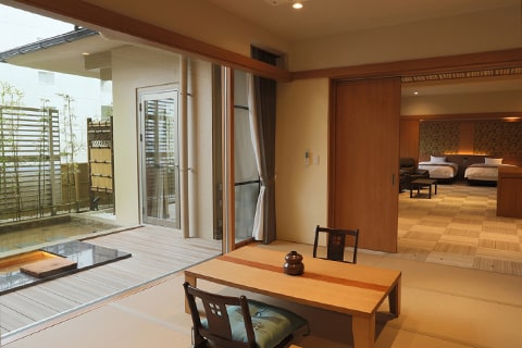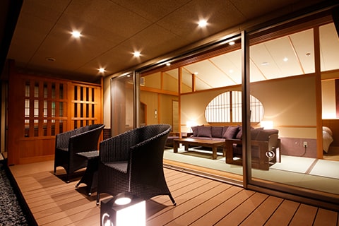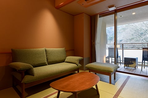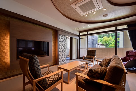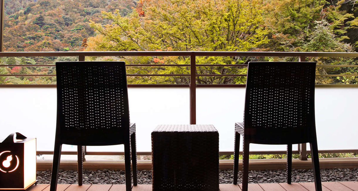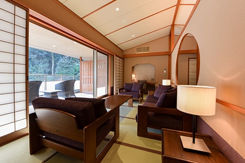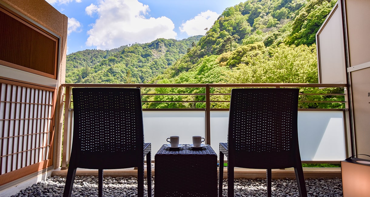 広々としたベッドルームとテラスに面したソファールーム付の特別室です。テラスにはのどかな六甲山の風景が広がり、癒しのひとときをお過ごしいただけます。木々を通り抜ける風、山々の四季を感じながら、有馬名物「金泉」をお愉しみください。