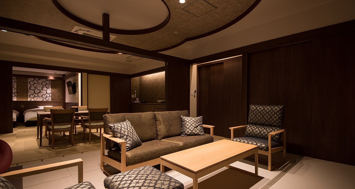 広いソファールーム・テーブルのあるダイニングルーム・ベッドルーム3部屋が連なるスタジオスイートルームタイプになります。